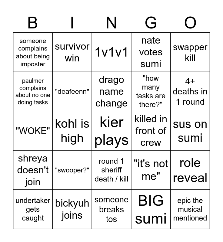 This bingo card has a free space and 59 words: ngan joins, bickyuh joins, sumi doesn't join, shreya doesn't join, BIG sumi, mini darken, "deafeenn", "__ touched me", "how many tasks are there?", someone complains about the map, nate votes sumi, paulmer votes kohl, paulmer complains about no one doing tasks, ryan complains about doing tasks, sumi wants skeld, someone complains about being imposter, epic the musical mentioned, swapper kill, everyone is yelling, drago name change, killed in front of crew, 1v1v1, undertaker gets caught, role reveal, "not to role reveal", nate goes afk, killer v killer, win from sabotage, 4+ deaths in 1 round, win off tasks, "WOAAHHH" -everyone, "likely story..", lovers win, guardian angel win, survivor win, jester win, seysela is high, kohl is high, "idk what my role does", "WOKE", death during meeting, "swooper?", sus on sumi, button barry, apple killer mentioned, altruist does something, "what's ur pathing?", kier dies first, round 1 sheriff death / kill, someone breaks tos, "what's the code?", "vote me", mayor reveal, "i think it's morphling", seysela crashes out, "it's not me", "i saw __ vent", killer kills other killer first and kier survives game.