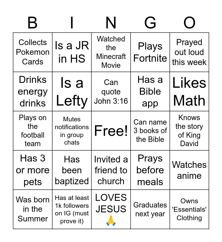 This bingo card has a free space and 24 words: Has been baptized, Has at least 1k followers on IG (must prove it), Can quote John 3:16, Was born in the Summer, Prayed out loud this week, Collects Pokemon Cards, Drinks energy drinks, Is a JR in HS, Can name 3 books of the Bible, Invited a friend to church, Has a Bible app, Plays on the football team, Prays before meals, Watches anime, Is a Lefty, Graduates next year, Knows the story of King David, Watched the Minecraft Movie, Likes Math, Mutes notifications in group chats, Owns 'Essentials' Clothing, Has 3 or more pets, Plays Fortnite and LOVES JESUS 🙏.