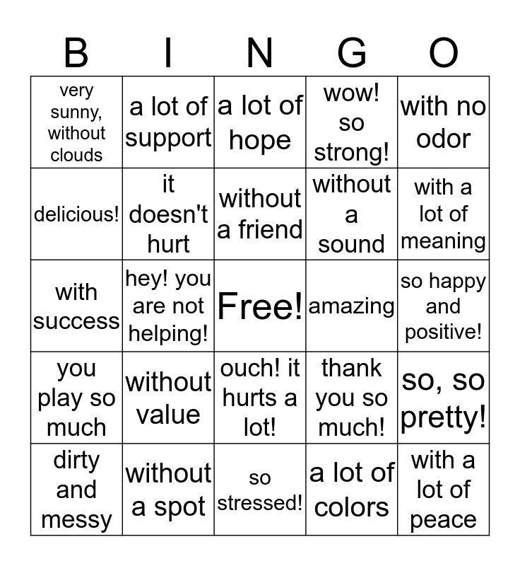 This bingo card has a free space and 24 words: without value, without a spot, without a friend, dirty and messy, with no odor, very sunny, without clouds, delicious!, a lot of support, amazing, ouch! it hurts a lot!, without a sound, with success, thank you so much!, so, so pretty!, it doesn't hurt, a lot of colors, so happy and positive!, a lot of hope, with a lot of meaning, hey! you are not helping!, with a lot of peace, you play so much, wow! so strong! and so stressed!.