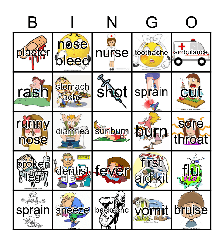 This bingo card has 34 images, a free space and 34 words: stitches, headache, operation, cough, sore throat, rash, stomach ache, backache, sprain, bruise, runny nose, nose bleed, vomit, graze, broken leg, diarrhea, fever, burn, flu, sprain, sneeze, stretch, toothache, cut, doctor, dentist, nurse, hospital, ambulance, plaster, bandage, shot, first aid kit and tweezers.
