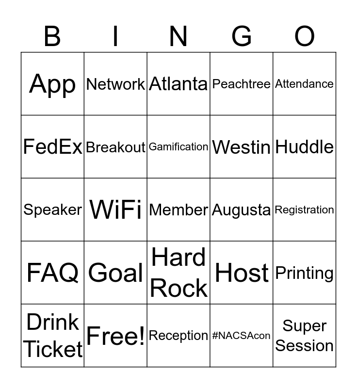 This bingo card has 30 words: Free!, Plenary, WiFi, Clint Smith, App, Atlanta, Breakout, Hard Rock, Augusta, Reception, Registration, Member, #NACSAcon, Super Session, Huddle, Conference, Host, FAQ, Goal, Attendance, Speaker, Diversity, Network, Westin, FedEx, Peachtree, Printing, Drink Ticket, Gamification and Stand Together.