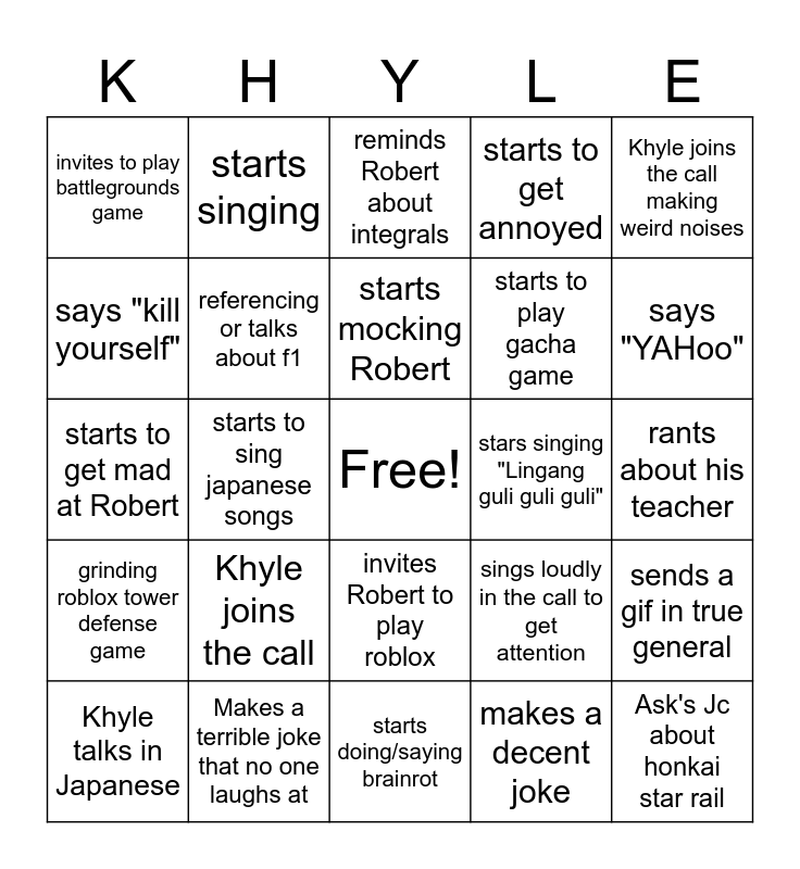 This bingo card has a free space and 24 words: Khyle joins the call, Makes a terrible joke that no one laughs at, starts mocking Robert, Khyle talks in Japanese, Khyle joins the call making weird noises, invites to play battlegrounds game, says "kill yourself", starts singing, stars singing "Lingang guli guli guli", invites Robert to play roblox, starts to play gacha game, starts to get mad at Robert, sings loudly in the call to get attention, sends a gif in true general, referencing or talks about f1, makes a decent joke, rants about his teacher, reminds Robert about integrals, says "YAHoo", starts to sing japanese songs, Ask's Jc about honkai star rail, grinding roblox tower defense game, starts to get annoyed and starts doing/saying brainrot.