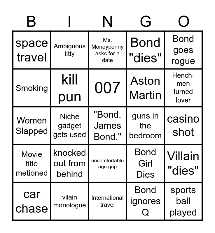 This bingo card has a free space and 29 words: car chase, foot chase, Niche gadget gets used, Ms. Moneypenny asks for a ring, space travel, Ms. Moneypenny asks for a date, kill pun, knocked out from behind, guns in the bedroom, vilain monologue, casino shot, sports ball played, International travel, Bond ignores Q, Hench-men turned lover, Martini (shaken not stirred), uncomfortable age gap, Movie title metioned, Bond goes rogue, Women Slapped, Bond Girl Dies, General Misogyny, Aston Martin, Smoking, Bond "dies", Ambiguous titty, Villain "dies", 007 and Bond gets Laid.