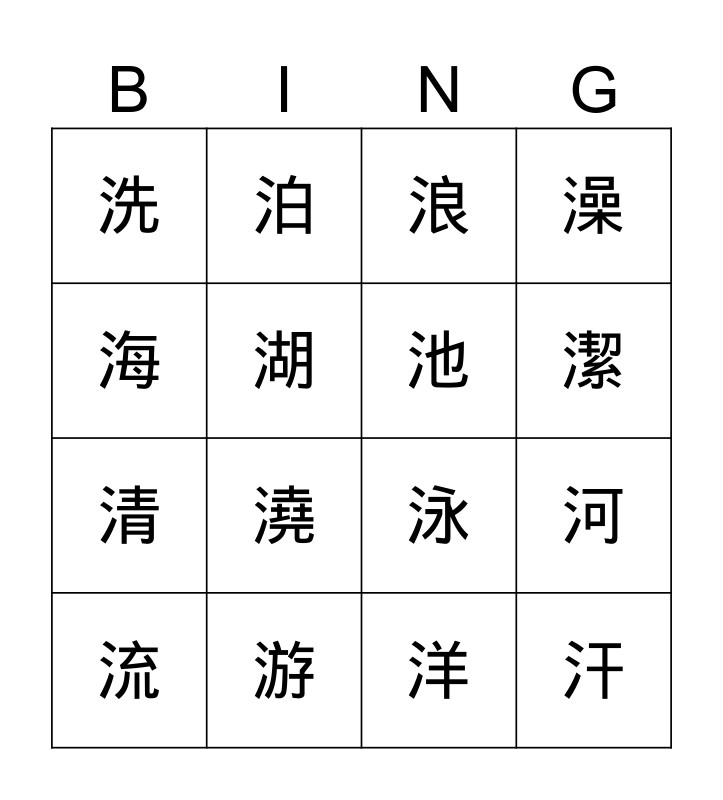 This bingo card has 16 words: 游, 河, 浪, 洗, 清, 泊, 泳, 洋, 海, 湖, 流, 澡, 澆, 潔, 池 and 汗.