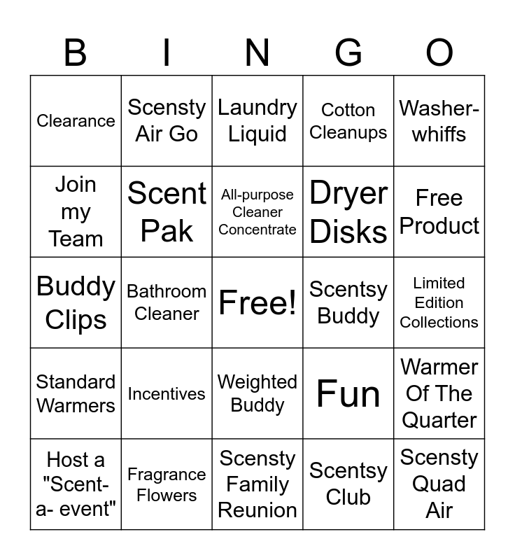 This bingo card has a free space and 29 words: Host a "Scent-a- event", Scensty Suds, Bathroom Cleaner, Disney, Clearance, Laundry Liquid, Scent Pak, Incentives, Scentsy Buddy, Fragrance Flowers, Limited Edition Collections, Scensty Quad Air, Scensty Family Reunion, Scentsy Club, Free Product, Harry Potter, Weighted Buddy, Standard Warmers, Washer-whiffs, Buddy Clips, Fun, Counter Clean, Dryer Disks, Join my Team, Cotton Cleanups, Scensty Air Go, Warmer Of The Quarter, All-purpose Cleaner Concentrate and Scentsy Fresh.