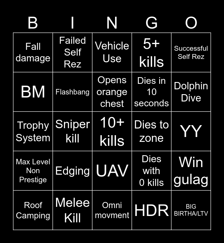 This bingo card has 50 words: Win game, 10+ kills, Camping, Omni movment, Edging, TTV (Etc), Failed Self Rez, Use smokes, BM, AFK, Flashbang, 5+ kills, Win gulag, Dies with 0 kills, Uses killstreak, Uses loadout, Opens orange chest, Dies to zone, Krig, Successful Self Rez, Sniper kill, HDR, Fall damage, Dies in 10 seconds, Dies to Killstreak, BIG BIRTHA/LTV, Dolphin Dive, Uses Stims, Vehicle Use, UAV, Heartbeat, Throwing knife kill, More than $15K, Most Wanted Kill, Melee Kill, Use a Heli, Gas Mask, JailBreak, Drop shot, YY, Equip a Satchel, Complete a contract, Use Buy Station, Stick an enemy with lethal, Roof Camping, Trophy System, *FREE*, Vehicle Kill, Max Level Non Prestige and *FREE*.