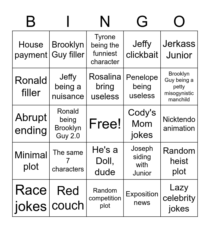 This bingo card has a free space and 24 words: The same 7 characters, Red couch, Rosalina bring useless, Race jokes, Jerkass Junior, House payment, Ronald filler, Brooklyn Guy filler, Cody's Mom jokes, He's a Doll, dude, Penelope being useless, Abrupt ending, Joseph siding with Junior, Random heist plot, Jeffy being a nuisance, Exposition news, Nicktendo animation, Tyrone being the funniest character, Brooklyn Guy being a petty misogynistic manchild, Ronald being Brooklyn Guy 2.0, Lazy celebrity jokes, Minimal plot, Jeffy clickbait and Random competition plot.