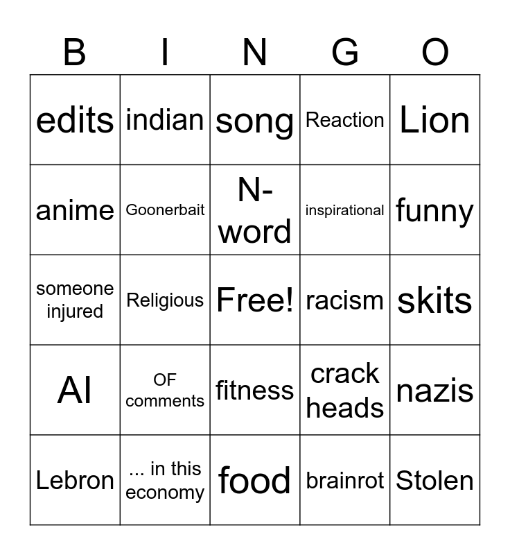 This bingo card has a free space and 24 words: OF comments, ... in this economy, N-word, Lebron, Lion, edits, anime, indian, racism, fitness, inspirational, someone injured, crack heads, nazis, Goonerbait, brainrot, skits, song, funny, Religious, Stolen, AI, Reaction and food.