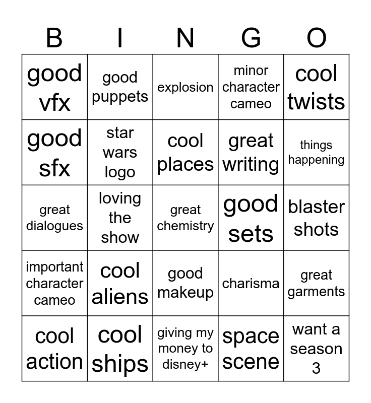 This bingo card has a free space and 24 words: cool aliens, cool ships, cool places, cool action, cool twists, good vfx, good sfx, good puppets, good sets, good makeup, great writing, great dialogues, charisma, great garments, star wars logo, space scene, blaster shots, explosion, things happening, loving the show, want a season 3, important character cameo, minor character cameo and giving my money to disney+.