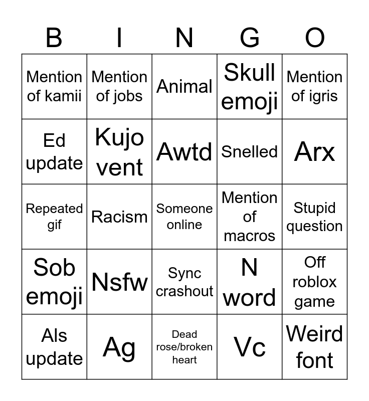 This bingo card has a free space and 24 words: Nsfw, Ag, Awtd, Als update, Mention of igris, Mention of kamii, Ed update, Mention of jobs, Mention of macros, Sync crashout, Snelled, Repeated gif, N word, Off roblox game, Kujo vent, Vc, Stupid question, Animal, Arx, Racism, Weird font, Sob emoji, Skull emoji and Dead rose/broken heart.