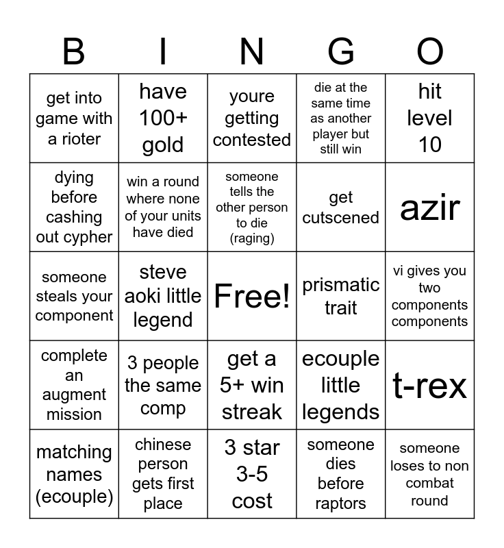 This bingo card has a free space and 24 words: 3 people the same comp, chinese person gets first place, someone tells the other person to die (raging), matching names (ecouple), hit level 10, get into game with a rioter, dying before cashing out cypher, have 100+ gold, prismatic trait, get a 5+ win streak, get cutscened, someone steals your component, ecouple little legends, t-rex, win a round where none of your units have died, someone dies before raptors, vi gives you two components components, youre getting contested, azir, steve aoki little legend, someone loses to non combat round, complete an augment mission, die at the same time as another player but still win and 3 star 3-5 cost.