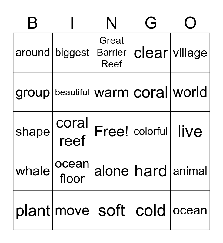 This bingo card has a free space and 24 words: ocean floor, move, warm, plant, village, around, group, biggest, colorful, alone, coral, shape, hard, animal, beautiful, cold, live, Great Barrier Reef, world, coral reef, ocean, whale, clear and soft.