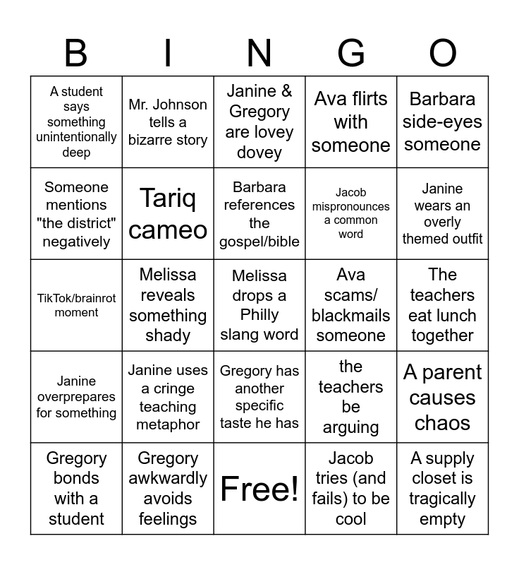 This bingo card has 25 words: Janine overprepares for something, Gregory awkwardly avoids feelings, Melissa drops a Philly slang word, Jacob tries (and fails) to be cool, Barbara side-eyes someone, A student says something unintentionally deep, Mr. Johnson tells a bizarre story, Janine & Gregory are lovey dovey, Ava scams/ blackmails someone, A parent causes chaos, Someone mentions "the district" negatively, Tariq cameo, Free!, the teachers be arguing, Janine wears an overly themed outfit, Gregory bonds with a student, Melissa reveals something shady, Barbara references the gospel/bible, Jacob mispronounces a common word, The teachers eat lunch together, TikTok/brainrot moment, Janine uses a cringe teaching metaphor, Gregory has another specific taste he has, Ava flirts with someone and A supply closet is tragically empty.