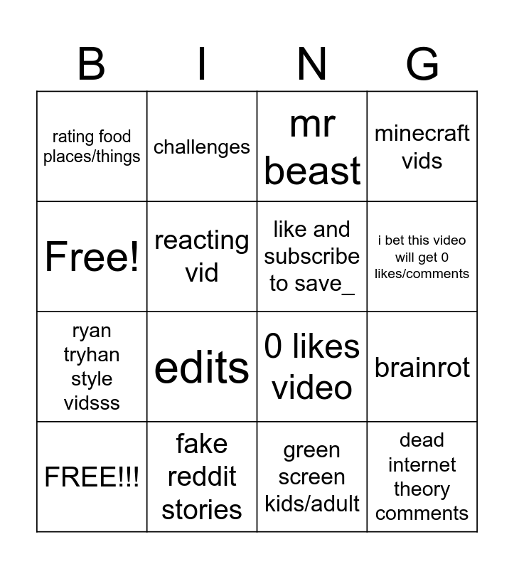 This bingo card has 16 words: fake reddit stories, brainrot, mr beast, rating food places/things, ryan tryhan style vidsss, challenges, 0 likes video, green screen kids/adult, Free!, reacting vid, FREE!!!, minecraft vids, edits, i bet this video will get 0 likes/comments, like and subscribe to save_ and dead internet theory comments.
