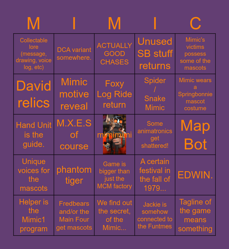 This bingo card has a free space and 24 words: phantom tiger, Fredbears and/or the Main Four get mascots, Foxy Log Ride return, Helper is the Mimic1 program, Mimic's victims possess some of the mascots, Collectable lore (message, drawing, voice log, etc), David relics, DCA variant somewhere., Some animatronics get shattered!, Game is bigger than just the MCM factory, Spider / Snake Mimic, Hand Unit is the guide., A certain festival in the fall of 1979..., EDWIN., Mimic motive reveal, Jackie is somehow connected to the Funtmes, Map Bot, ACTUALLY GOOD CHASES, Mimic wears a Springbonnie mascot costume, M.X.E.S of course, Tagline of the game means something, Unique voices for the mascots, Unused SB stuff returns and We find out the secret, of the Mimic....