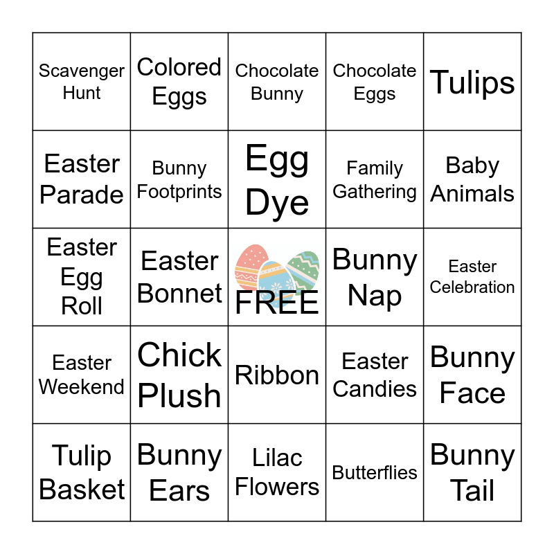 This bingo card has a free space and 75 words: Easter Bunny, Easter Egg, Chocolate Bunny, Easter Basket, Pastel Colors, Marshmallow Peeps, Easter Lily, Egg Hunt, Jelly Beans, Hot Cross Buns, Easter Sunday, Spring Flowers, Egg Dye, Easter Parade, Chick, Easter Bonnet, Lamb, Bunny Tail, Cadbury Eggs, Tulips, Easter Grass, Easter Egg Roll, Bunny Footprints, Colored Eggs, Chocolate Eggs, Easter Dinner, Egg Shells, Easter Songs, White Chocolate Bunny, Egg Decorating Kit, Easter Craft, Spring Rain, Springtime, Easter Candies, Baby Animals, Family Gathering, Springtime Picnic, Garden, Easter Celebration, Butterflies, Flower Crown, Bunny Cake, Chick Hatching, Easter Card, Sugar Cookies, Easter Tree, Tulip Basket, Scavenger Hunt, Golden Egg, Easter Egg Cupcakes, Easter Party, Ribbon, Easter Hats, Easter Coloring Book, Egg Roll Race, Lilies of the Valley, Spring Break, Easter Egg Sticker, Easter Coloring Page, Bunny Plush, Chick Plush, Flower Pot, Chocolate Coins, Butterfly Decor, Egg Decorating Contest, Bunny Nap, Easter Stamp, Spring Breeze, Jelly Bean Jar, Bunny Face, Easter Weekend, Bunny Ears, Easter Picnic, Lilac Flowers and Carrot cake.