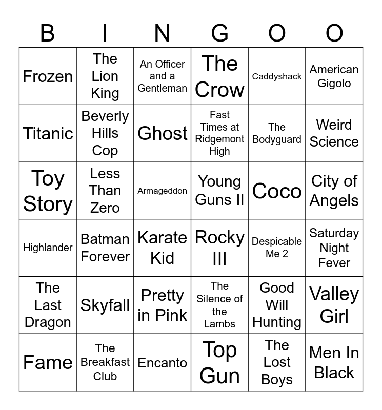 This bingo card has 74 words: Risky Business, Top Gun, An Officer and a Gentleman, Dirty Dancing, Grease, Purple Rain, The Breakfast Club, Rocky IV, Karate Kid, Back to the Future, Pretty in Pink, Flashdance, Beverly Hills Cop, American Gigolo, White Nights, Weird Science, The Last Dragon, Fast Times at Ridgemont High, Footloose, The Bodyguard, Titanic, The Lion King, The Crow, The Silence of the Lambs, Toy Story, Pulp Fiction, Clerks, Poetic Justice, Shrek, Pitch Perfect, Caddyshack, The Goonies, Beetlejuice, Ghost Busters, Fame, Saturday Night Fever, Vision Quest, Arthur, Dangerous Minds, Men In Black, Despicable Me 2, Rocky III, O Bother, Where Art Thou?, Kill Bill Vol. 1, A Star Is Born, Frozen, Skyfall, Coco, The Lego Movie, Encanto, Trolls, The Never Ending Story, Armageddon, Mamma Mia!, Guardians of the Galaxy, Bridesmaids, City of Angels, Good Will Hunting, The X Files, Batman Forever, Ghost, The Big Lebowski, Young Guns II, The Lost Boys, Less Than Zero, Valley Girl, Say Anything, La Bamba, Highlander, Stand By Me, The Rocky Horror Picture Show, Rocky, The Muppet Movie and The Graduate.