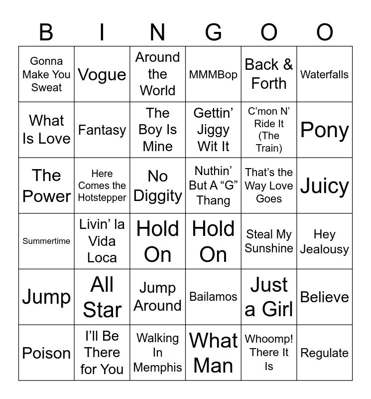 This bingo card has 65 words: Wonderwall, Just a Girl, No Scrubs, Livin’ la Vida Loca, All Star, The Sign, Vogue, Mr. Jones, Fantasy, Lovefool, Juicy, Wannabe, No Diggity, Back & Forth, Say My Name, Waterfalls, Pony, Gonna Make You Sweat, Don’t Speak, The Boy Is Mine, That’s the Way Love Goes, Nuthin’ But A “G” Thang, MMMBop, Poison, Real Love, Whoomp! There It Is, Walking In Memphis, Thieves in the Temple, The Power, Remember the Time, Hold On, My Boo, Missing, Intergalactic, Summertime, Hold On, Freedom! ’90, C’mon N’ Ride It (The Train), Hey Jealousy, Regulate, What Is Love, Jump Around, Here Comes the Hotstepper, 7, Fastlove, Pt. 1, I’ll Be There for You, Gettin’ Jiggy Wit It, You Were Meant For Me, Jump, Bailamos, Finally, Motownphilly, Jesus to a Child, Steal My Sunshine, Baby Got Back, I Love You Always Forever, How Bizarre, Around the World, Believe, What Man, I Want You, Thank You, I Adore Mi Amore, Hand in My Pocket and Hypnotize.