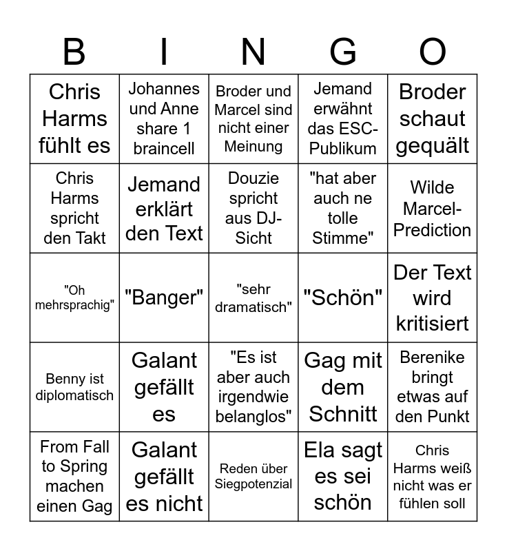 This bingo card has a free space and 24 words: Galant gefällt es, Galant gefällt es nicht, Douzie spricht aus DJ-Sicht, From Fall to Spring machen einen Gag, Broder schaut gequält, Chris Harms fühlt es, Chris Harms spricht den Takt, Johannes und Anne share 1 braincell, "Schön", "Es ist aber auch irgendwie belanglos", "hat aber auch ne tolle Stimme", "Oh mehrsprachig", Gag mit dem Schnitt, Berenike bringt etwas auf den Punkt, Jemand erklärt den Text, Ela sagt es sei schön, Der Text wird kritisiert, Broder und Marcel sind nicht einer Meinung, Wilde Marcel-Prediction, "Banger", Chris Harms weiß nicht was er fühlen soll, Benny ist diplomatisch, Jemand erwähnt das ESC-Publikum and Reden über Siegpotenzial.