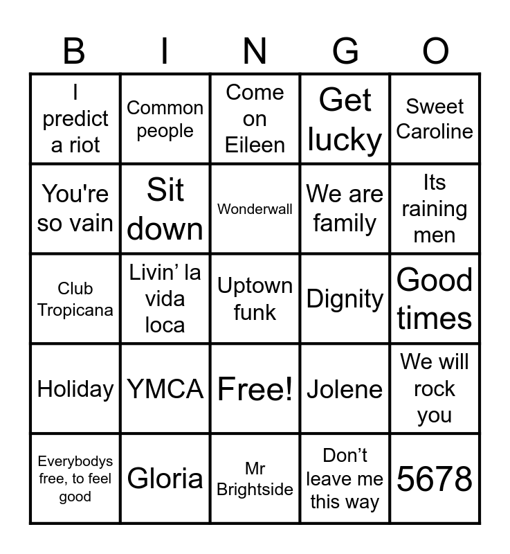 This bingo card has 26 words: Free!, Don’t leave me this way, Wonderwall, Gloria, Sweet Caroline, I predict a riot, You're so vain, Common people, Good times, Jolene, We are family, Club Tropicana, We will rock you, Everybodys free, to feel good, Livin’ la vida loca, She's a belter, Get lucky, Holiday, Come on Eileen, Uptown funk, Its raining men, Mr Brightside, Dignity, YMCA, Sit down and 5678.