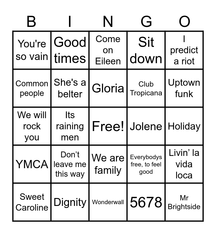 This bingo card has a free space and 25 words: Don’t leave me this way, Wonderwall, Gloria, Sweet Caroline, I predict a riot, You're so vain, Common people, Good times, Jolene, We are family, Club Tropicana, We will rock you, Everybodys free, to feel good, Livin’ la vida loca, She's a belter, Get lucky, Holiday, Come on Eileen, Uptown funk, Its raining men, Mr Brightside, Dignity, YMCA, Sit down and 5678.