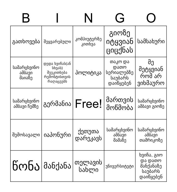 This bingo card has a free space and 24 words: წონა, იაპონური, პოლიტიკა, უნივერსიტეტი, სამსახური, გათხოვება, შეყვარებული, კომპიუტერზე კითხვა, მართვის მოწმობა, სამარცხვინო ამბავი გიოზე, სამარცხვინო ამბავი ჩემზე, დედა ხვიჩას(ან სხვას) შეეკითხება რემონტისთვის რაღაცეებს, სამარცხვინო ამბავი მამაზე, სამარცხვინო ამბავი თამრიკოზე, სამარცხვინო ამბავი მაიაზე, მანქანა, თელავის სახლი, გიოზე იტყვიან ციცქნას, მე მეტყვიან რომ არ ვიხმაურო, შემოსავალი, გერმანია, ქეთუთა დარეკავს, თაკო და დათო სერიალებზე საუბარს დაიწყებენ and ხვიჩა, გიო და დათო მანქანაზე საუბარს დაიწყებენ.
