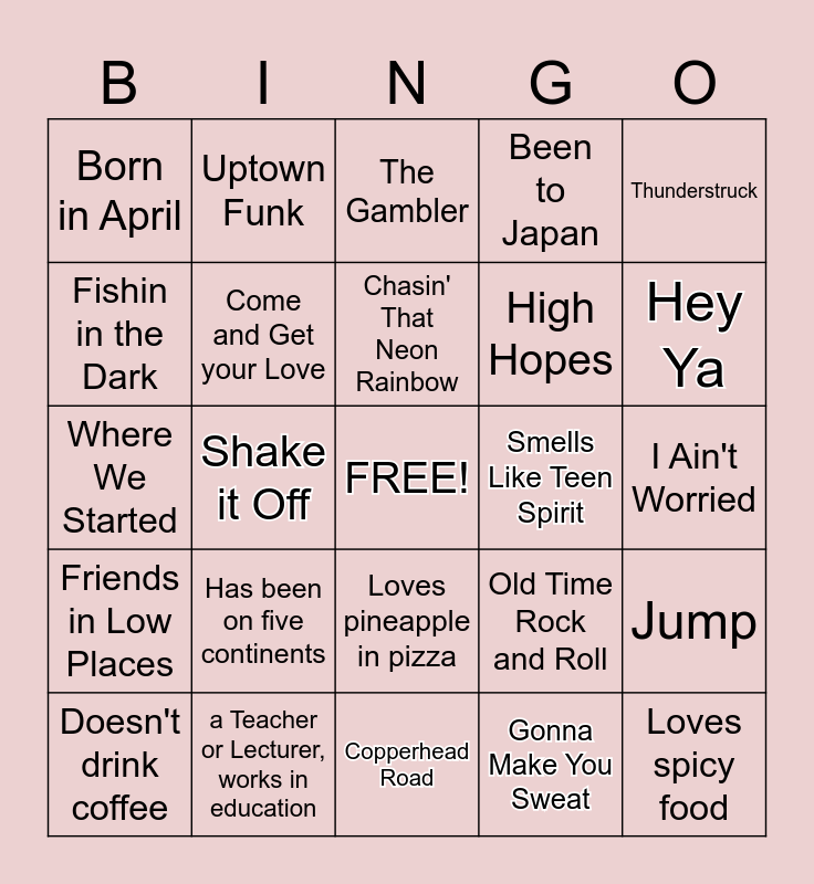 This bingo card has a free space and 87 words: Cha Cha Slide, Sweet Home Alabama, Copperhead Road, Footloose, Cotton Eyed Joe, Macarena, Cupid Shuffle, YMCA, Electric Slide, Service, Low, Any Man of Mine, Gonna Make You Sweat, Hey Ya, U Can't Touch This, Shake it Off, Yeah, In Da Club, Wannabe, Jump Around, Don't Stop Believing, Love Shack, Smells Like Teen Spirit, Girls Just Want to Have Fun, Fergalicious, Wop, Wobble, What's Up?, Dance Monkey, Ice Ice Baby, Boot Scootin Boogie, Should I Stay or Should I Go, Stayin Alive, I Ain't Worried, Where We Started, Out In the Middle, Chasin' That Neon Rainbow, Dancin in the Dark, Jump, Friends in Low Places, Chattahoochee, I want it that way, Brickhouse, Thunderstruck, Plastic Hearts, Uptown Funk, Ex's and Oh's, High Hopes, Pump Up the Jam, I Love Rock n Roll, You Shook Me All Night Long, You're the One That I Want, Old Time Rock and Roll, Pour Some Sugar on Me, Sunday Best, Forever and Ever Amen, The Gambler, Take Me Home, Country Road, Happy, Fishin in the Dark, Come and Get your Love, Its Ticky, Has a manual driver's licence, Left handed, Played in a band, Uses IPhone, Had ACL/Knee surgery in the past, Doesn't drink coffee, Has been on five continents, Loves pineapple in pizza, Has a pet photo on your phone wallpaper, Loves spicy food, Born in April, a Teacher or Lecturer, works in education, Has a pet, Speaks 2 or more languages, Always wears sunblock when umpiring, Have given a Red card in a game, Received a Yellow card when they played Comes early or 20 mins earlier before the game, Ever forgot an appointed game, Kept more than 3 whistle in their umpiring bag/pouch, Generation Z, Loves cakes, Perfect eyesight, Born on the same month as you, Been to Japan and First time in Singapore.