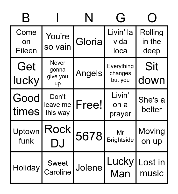 This bingo card has a free space and 38 words: Sweet Dreams, I should be so lucky, Music sounds better with you, Never gonna give you up, Moving on up, Rock DJ, Angels, Simply the best, Rolling in the deep, Everything changes but you, Don’t leave me this way, Livin’ la vida loca, Lost in music, She's a belter, Get lucky, Uptown funk, YMCA, Gloria, We will rock you, Livin' on a prayer, Come on Eileen, Sweet Caroline, Sit down, Holiday, We are family, Jolene, Dignity, I predict a riot, Common people, Its raining men, Wonderwall, 5678, Lucky Man, You're so vain, Everybodys free, to feel good, Mr Brightside, Good times and Club Tropicana.