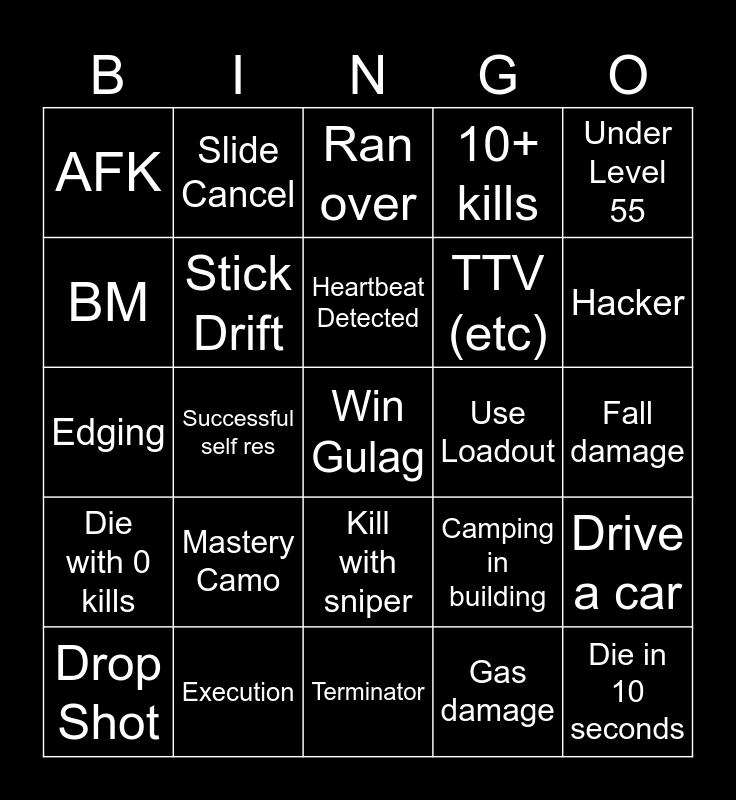 This bingo card has a free space and 24 words: Mastery Camo, Execution, Heartbeat Detected, Drop Shot, Under Level 55, AFK, BM, Slide Cancel, Use Loadout, Kill with sniper, TTV (etc), Edging, Camping in building, Drive a car, Stick Drift, Gas damage, Fall damage, Ran over, Hacker, Successful self res, Die in 10 seconds, Die with 0 kills, 10+ kills and Terminator.