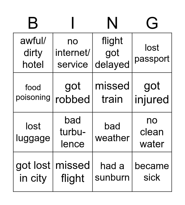 This bingo card has 16 words: missed flight, no clean water, flight got delayed, awful/ dirty hotel, lost luggage, no internet/ service, bad weather, had a sunburn, food poisoning, got robbed, got lost in city, lost passport, bad turbu-lence, got injured, missed train and became sick.