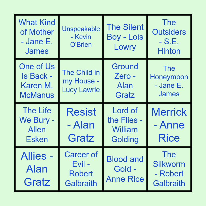 This bingo card has 16 words: Career of Evil - Robert Galbraith, Merrick - Anne Rice, The Silent Boy - Lois Lowry, What Kind of Mother - Jane E. James, The Life We Bury - Allen Esken, Unspeakable - Kevin O'Brien, Lord of the Flies - William Golding, Blood and Gold - Anne Rice, One of Us Is Back - Karen M. McManus, The Child in my House - Lucy Lawrie, Allies - Alan Gratz, The Outsiders - S.E. Hinton, Resist - Alan Gratz, The Honeymoon - Jane E. James, Ground Zero - Alan Gratz and The Silkworm - Robert Galbraith.