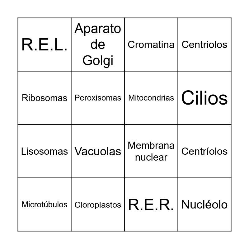 This bingo card has 19 words: Membrana nuclear, Nucleoplasma, Cromatina, Nucléolo, Centríolos, Ribosomas, R.E.R., R.E.L., Aparato de Golgi, Lisosomas, Vacuolas, Peroxisomas, Mitocondrias, Cloroplastos, Microtúbulos, Microfilamentos, Centriolos, Cilios and Flagelos.