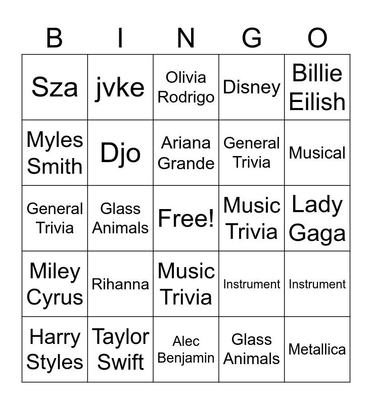 This bingo card has a free space and 24 words: Rihanna, Taylor Swift, Ariana Grande, Harry Styles, Billie Eilish, Sza, Myles Smith, jvke, Music Trivia, Music Trivia, General Trivia, General Trivia, Instrument, Instrument, Djo, Glass Animals, Lady Gaga, Olivia Rodrigo, Musical, Glass Animals, Metallica, Miley Cyrus, Disney and Alec Benjamin.