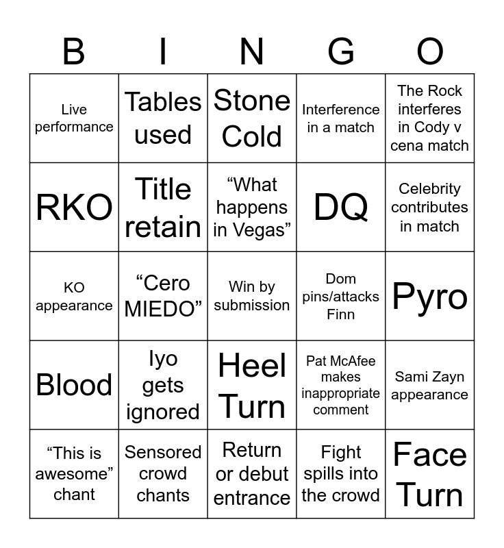 This bingo card has a free space and 27 words: Pat McAfee makes inappropriate comment, Someone slammed onto annnouncement table, DQ, Return or debut entrance, RKO, Stone Cold, Tables used, Blood, Dom pins/attacks Finn, Sami Zayn appearance, KO appearance, Interference in a match, “This is awesome” chant, Sensored crowd chants, Celebrity contributes in match, Title change, Title retain, “What happens in Vegas”, Iyo gets ignored, Live performance, Pyro, Fight spills into the crowd, “Cero MIEDO”, Face Turn, Heel Turn, The Rock interferes in Cody v cena match and Bianca gets her hair pulled.