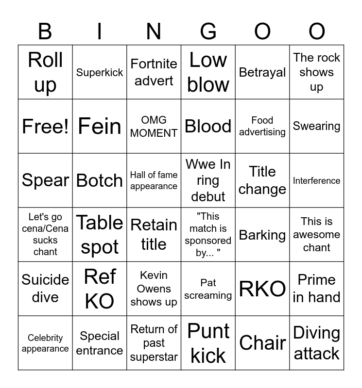 This bingo card has 36 words: Let's go cena/Cena sucks chant, Table spot, Return of past superstar, Blood, Title change, Interference, Roll up, Special entrance, Fortnite advert, Pat screaming, Food advertising, The rock shows up, Suicide dive, Botch, OMG MOMENT, Low blow, RKO, This is awesome chant, Free!, Fein, Retain title, "This match is sponsored by... ", Barking, Prime in hand, Spear, Superkick, Hall of fame appearance, Punt kick, Betrayal, Swearing, Celebrity appearance, Ref KO, Kevin Owens shows up, Wwe In ring debut, Chair and Diving attack.
