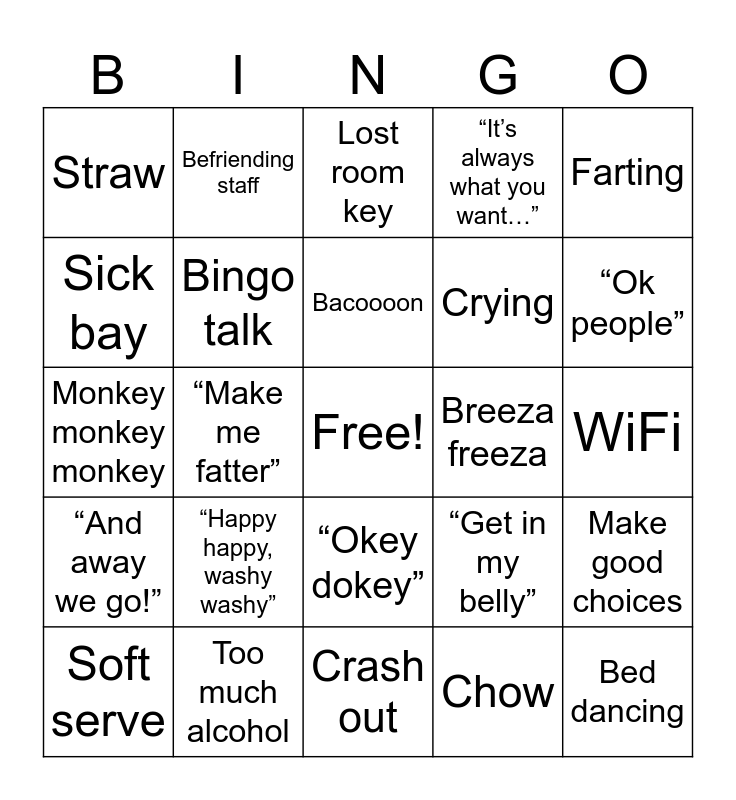 This bingo card has a free space and 24 words: “Happy happy, washy washy”, Too much alcohol, Bacoooon, Soft serve, Farting, Straw, Sick bay, Befriending staff, Breeza freeza, “Okey dokey”, Crying, Monkey monkey monkey, “Get in my belly”, Make good choices, Bingo talk, Chow, WiFi, Lost room key, “Ok people”, “Make me fatter”, Bed dancing, “And away we go!”, “It’s always what you want…” and Crash out.