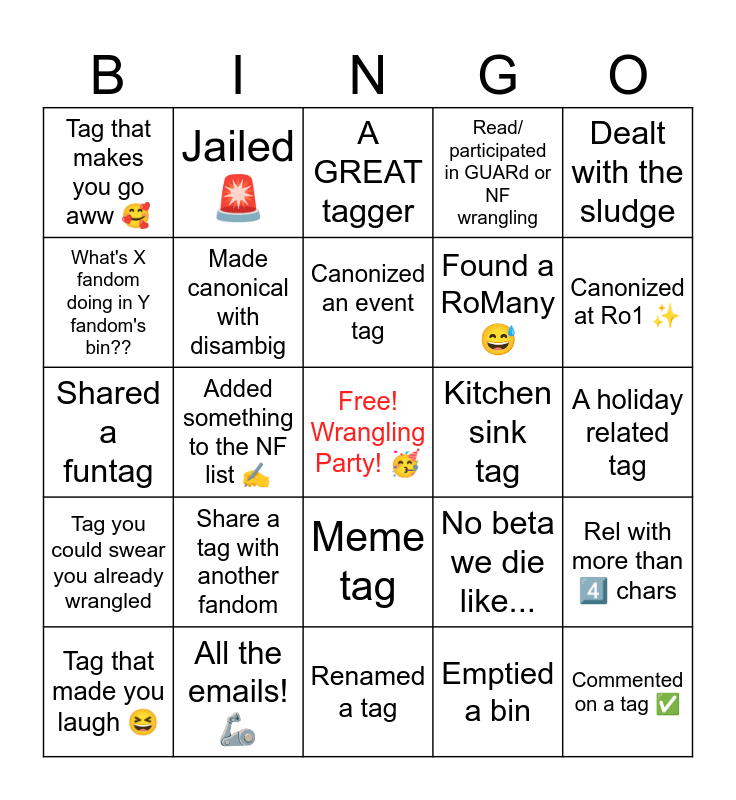This bingo card has a free space and 24 words: Share a tag with another fandom, All the emails! 🦾, Canonized an event tag, Tag that made you laugh 😆, Dealt with the sludge, Tag that makes you go aww 🥰, What's X fandom doing in Y fandom's bin??, Jailed 🚨, Kitchen sink tag, Meme tag, Found a RoMany 😅, Shared a funtag, No beta we die like..., Rel with more than 4️⃣ chars, Made canonical with disambig, Emptied a bin, A holiday related tag, A GREAT tagger, Canonized at Ro1 ✨, Added something to the NF list ✍️, Commented on a tag ✅, Tag you could swear you already wrangled, Read/ participated in GUARd or NF wrangling and Renamed a tag.