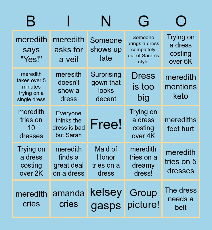 This bingo card has a free space and 27 words: meredith tries on a dreamy dress!, Dress is too small, Dress is too big, kelsey gasps, meredith takes over 5 minutes trying on a single dress, Someone shows up late, meredith asks for a veil, Trying on a dress costing over 2K, Trying on a dress costing over 4K, meredith tries on 5 dresses, meredith tries on 10 dresses, Someone brings a dress completely out of Sarah's style, meredith cries, amanda cries, meredith mentions keto, meredith trips over a train, meresith doesn't show a dress, Surprising gown that looks decent, meredith finds a great deal on a dress, meredith says "Yes!", merediths feet hurt, Group picture!, Everyone thinks the dress is bad but Sarah, The dress needs a belt, Maid of Honor tries on a dress, Trying on a dress costing over 6K and Sarah tries on a blush colored dress.