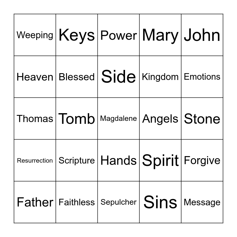 This bingo card has 40 words: Jesus, Thomas, Believe, Blessed, Faithless, Hands, Side, Finger, John, Resurrection, Tomb, Mary, Magdalene, Stone, Angels, Scripture, Disciples, Weeping, Peace, Power, Forgive, Sins, Kingdom, Heaven, Bind, Loose, Seen, Not Seen, Message, Door, Evening, Father, Send, Spirit, Emotions, Sepulcher, Breathe, Week, Keys and Thank You.
