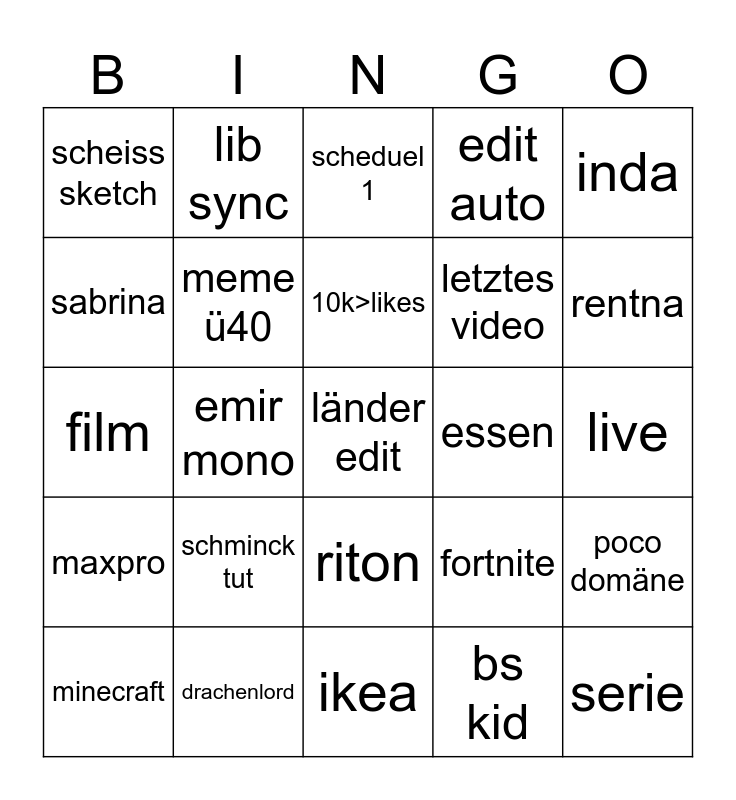 This bingo card has a free space and 24 words: schminck tut, drachenlord, 10k>likes, minecraft, inda, scheiss sketch, sabrina, lib sync, essen, riton, letztes video, film, fortnite, poco domäne, meme ü40, bs kid, live, scheduel 1, rentna, emir mono, serie, maxpro, edit auto and ikea.