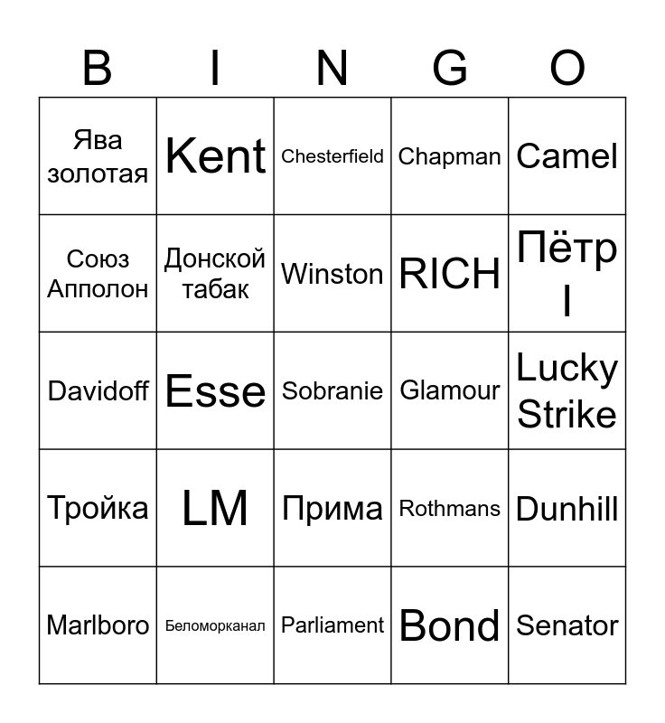 This bingo card has a free space and 24 words: Marlboro, LM, Winston, Bond, Camel, Ява золотая, Kent, Chesterfield, Glamour, Lucky Strike, Davidoff, Донской табак, Rothmans, Dunhill, Союз Апполон, Беломорканал, Parliament, Chapman, Пётр I, Тройка, Esse, Прима, RICH and Senator.