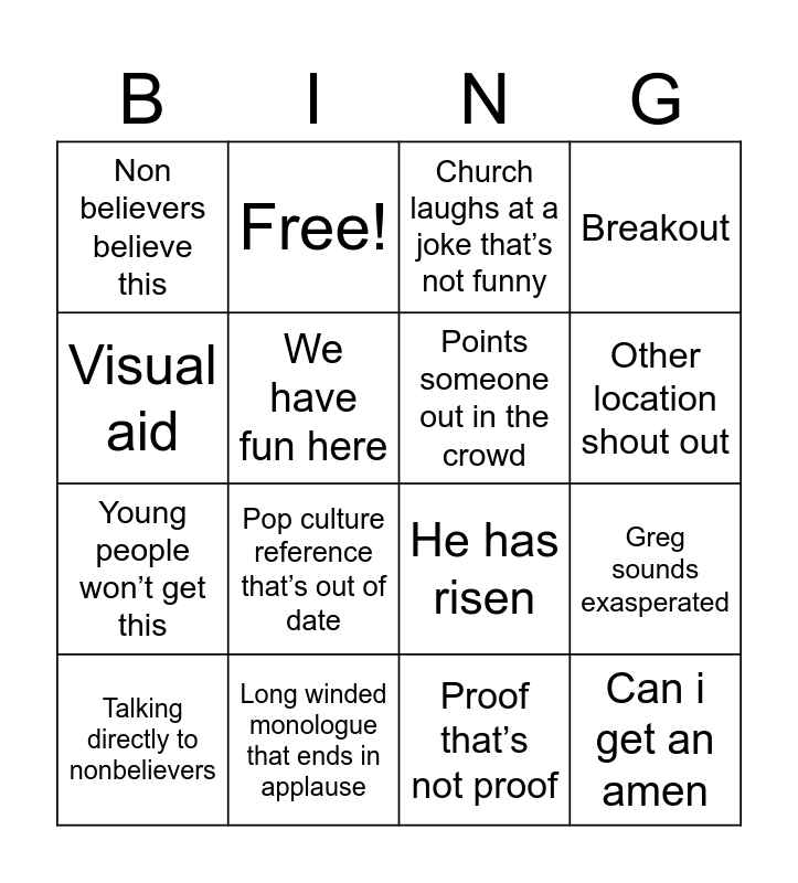 This bingo card has 19 words: He has risen, Celebrity mention Greg knows, Church laughs at a joke that’s not funny, Can i get an amen, Greg sounds exasperated, Visual aid, Proof that’s not proof, Non believers believe this, Free!, Young people won’t get this, Pop culture reference that’s out of date, We have fun here, Points someone out in the crowd, Long winded monologue that ends in applause, Talking directly to nonbelievers, We’re different here, Breakout, Other location shout out and Self deprecation.