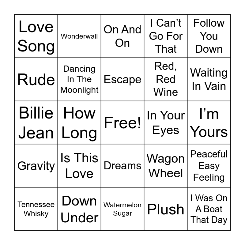 This bingo card has a free space and 40 words: Africa, Billie Jean, Come And Get Your Love, Dancing In The Moonlight, Down Under, Dreams, Escape, Fishin In The Dark, Follow You Down, Gravity, How Long, I Can’t Go For That, I Was On A Boat That Day, I’m Yours, In Your Eyes, Is This Love, Jamming, Love Song, Mr. Brightside, On And On, Peaceful Easy Feeling, Plush, Red, Red Wine, Rude, Santeria, Shut Up & Dance, Slow Dancing In A Burning Room, Somebody’s Baby, Steal Away, Sweet Caroline, Take It Easy, Tennessee Whisky, Three Little Birds, Wagon Wheel, Waiting In Vain, Watermelon Sugar, Wicked Game, Wonderful Tonight, Wonderwall and You Get What You Give.