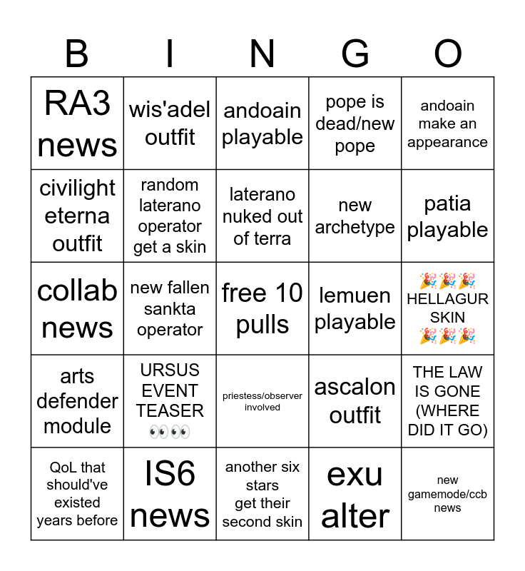 This bingo card has a free space and 24 words: URSUS EVENT TEASER 👀👀, IS6 news, laterano nuked out of terra, QoL that should've existed years before, andoain make an appearance, RA3 news, civilight eterna outfit, wis'adel outfit, lemuen playable, priestess/observer involved, new archetype, collab news, ascalon outfit, THE LAW IS GONE (WHERE DID IT GO), random laterano operator get a skin, exu alter, 🎉🎉🎉 HELLAGUR SKIN 🎉🎉🎉, andoain playable, patia playable, new fallen sankta operator, new gamemode/ccb news, arts defender module, pope is dead/new pope and another six stars get their second skin.
