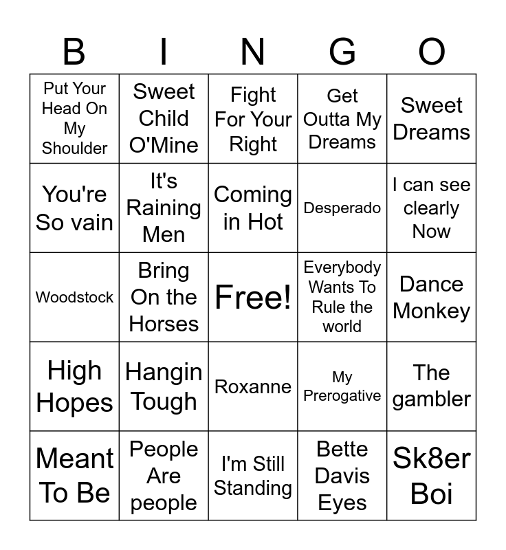 This bingo card has a free space and 24 words: Hangin Tough, People Are people, Coming in Hot, Meant To Be, Sweet Dreams, Put Your Head On My Shoulder, You're So vain, Sweet Child O'Mine, Everybody Wants To Rule the world, Roxanne, Desperado, Woodstock, My Prerogative, The gambler, It's Raining Men, Bette Davis Eyes, Dance Monkey, Fight For Your Right, I can see clearly Now, Bring On the Horses, Sk8er Boi, High Hopes, Get Outta My Dreams and I'm Still Standing.