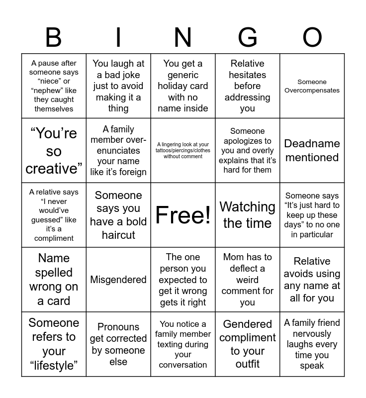 This bingo card has a free space and 24 words: Misgendered, Pronouns get corrected by someone else, A lingering look at your tattoos/piercings/clothes without comment, Someone refers to your “lifestyle”, Someone Overcompensates, A pause after someone says “niece” or “nephew” like they caught themselves, “You’re so creative”, You laugh at a bad joke just to avoid making it a thing, Watching the time, The one person you expected to get it wrong gets it right, Someone apologizes to you and overly explains that it’s hard for them, A relative says “I never would’ve guessed” like it’s a compliment, Mom has to deflect a weird comment for you, Relative avoids using any name at all for you, A family member over-enunciates your name like it’s foreign, Gendered compliment to your outfit, Someone says “It’s just hard to keep up these days” to no one in particular, You get a generic holiday card with no name inside, Deadname mentioned, Someone says you have a bold haircut, A family friend nervously laughs every time you speak, Name spelled wrong on a card, Relative hesitates before addressing you and You notice a family member texting during your conversation.