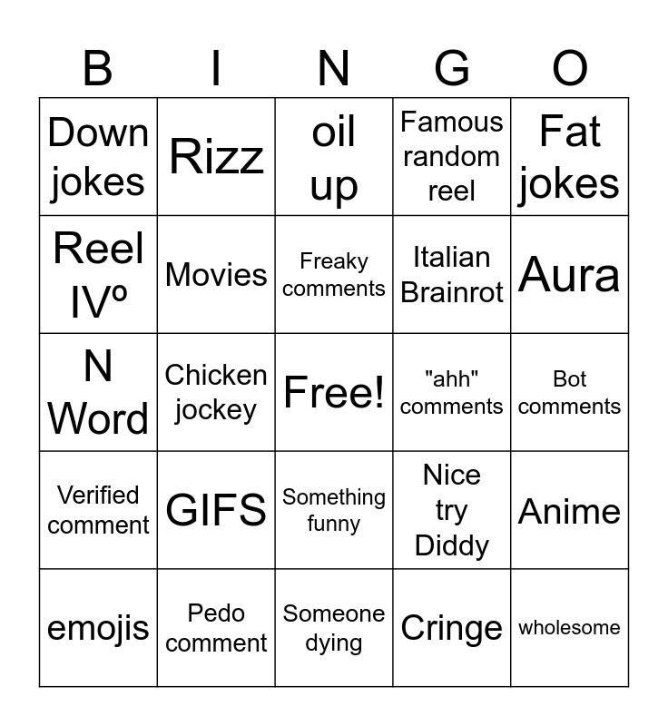 This bingo card has a free space and 24 words: GIFS, Pedo comment, Freaky comments, emojis, Fat jokes, Down jokes, Reel IVº, Rizz, "ahh" comments, Something funny, Italian Brainrot, N Word, Nice try Diddy, Anime, Movies, Cringe, Bot comments, oil up, Aura, Chicken jockey, wholesome, Verified comment, Famous random reel and Someone dying.