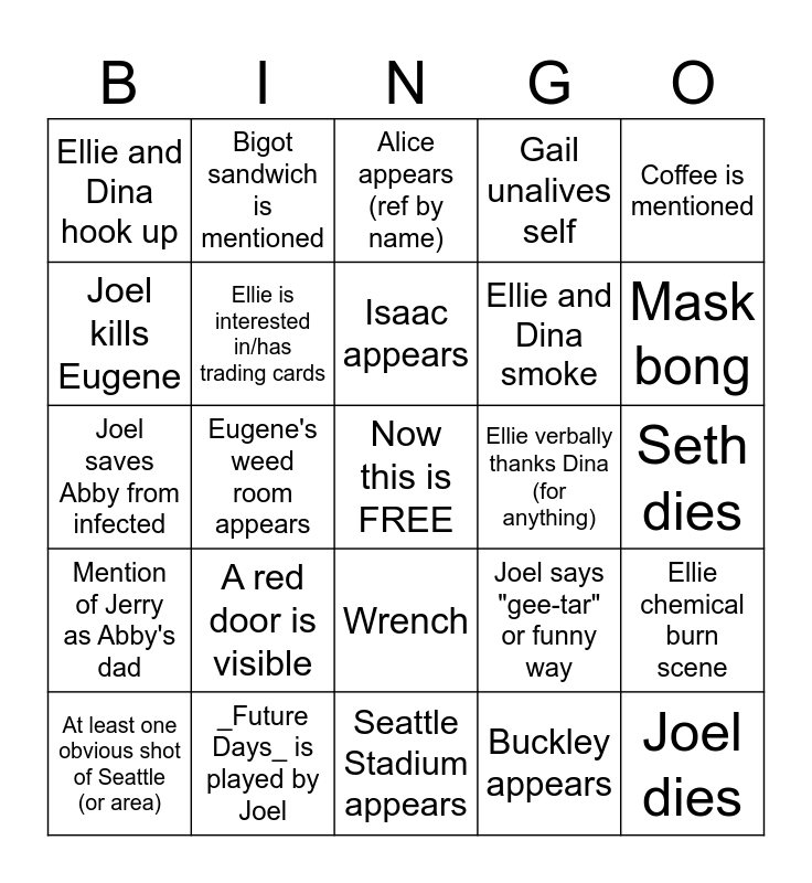 This bingo card has a free space and 53 words: Cameo from game crew (not Isaac), Joel dies, Joel doesn't die, Buckley appears, A red door is visible, A molly is used, Bigot sandwich is mentioned, Eugene knows Ellie is immune, Joel kills Eugene, Abby gives death blow to Joel with golf club, Ellie is interested in/has trading cards, Ellie tattooing scene, Ellie chemical burn scene, Joel says "gee-tar" or funny way, Joel tells eating clock/time-consuming joke, At least one obvious shot of Seattle (or area), Isaac appears, Ellie verbally thanks Dina (for anything), Dina disrupts Ellie's path, Coffee is mentioned, Eugene's weed room appears, Eugene's pr0n is referenced, Ellie and Dina smoke, Ellie and Dina hook up, Dina breaks a jar of joints, _Future Days_ is played by Joel, Gail utters "baby" (in any manner), Dina saves Ellie from an infected, There's a horse named Japan, Mask bong, "You swore", Abby/crew enters Jackson, Kat dies, Completely new type of infected, Abby Owen break-up implied, Mel's pregnancy, Gail unalives self, Seattle Stadium appears, Alice appears (ref by name), Bear appears (ref by name), Jesse wakes up Ellie, Brick is used, Seth dies, Known character turns/has turned into infected, Hammer for fighting, Wrench, Mel tourniquets Joel's leg, Ellie cuts someone's face open, Joel saves Abby from infected, Mention of Jerry as Abby's dad, Ellie tells Dina she's immune, Dina calls kids "little sh*ts" and WLF ID'd on patches/badges.