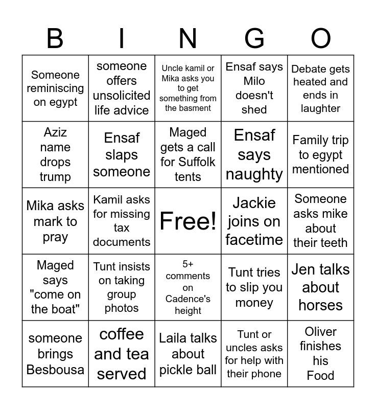 This bingo card has a free space and 24 words: Tunt insists on taking group photos, coffee and tea served, Maged gets a call for Suffolk tents, someone brings Besbousa, Debate gets heated and ends in laughter, Someone reminiscing on egypt, Aziz name drops trump, someone offers unsolicited life advice, Jackie joins on facetime, 5+ comments on Cadence's height, Ensaf says naughty, Mika asks mark to pray, Tunt tries to slip you money, Jen talks about horses, Ensaf slaps someone, Tunt or uncles asks for help with their phone, Someone asks mike about their teeth, Uncle kamil or Mika asks you to get something from the basment, Family trip to egypt mentioned, Kamil asks for missing tax documents, Oliver finishes his Food, Maged says "come on the boat", Ensaf says Milo doesn't shed and Laila talks about pickle ball.