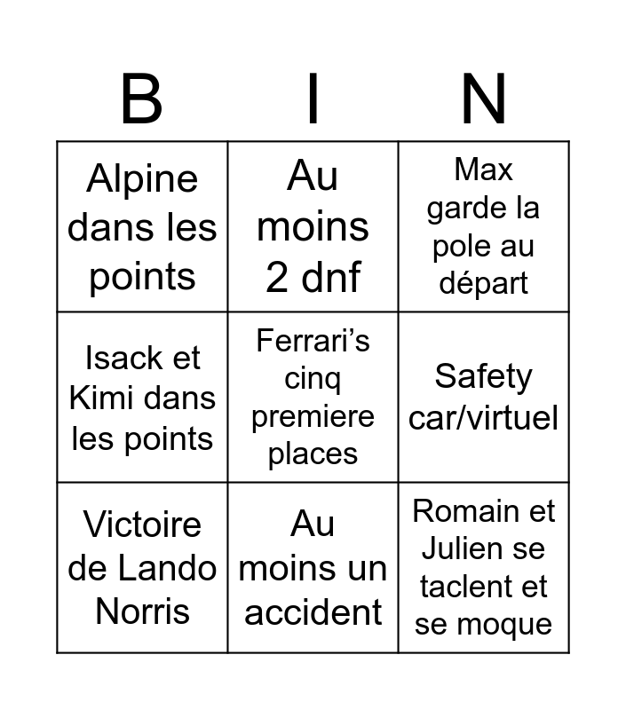This bingo card has a free space and 8 words: Safety car/virtuel, Max garde la pole au départ, Au moins 2 dnf, Victoire de Lando Norris, Alpine dans les points, Romain et Julien se taclent et se moque, Isack et Kimi dans les points and Au moins un accident.